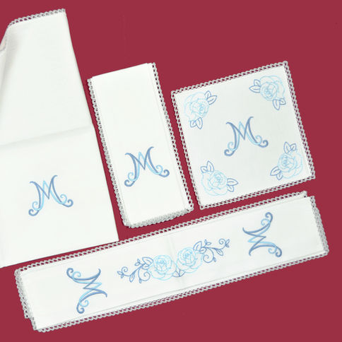 Raffinato Servizio S.Messa tessuto m/lino ricamo Monogramma/rose con merletto bianco/argento.