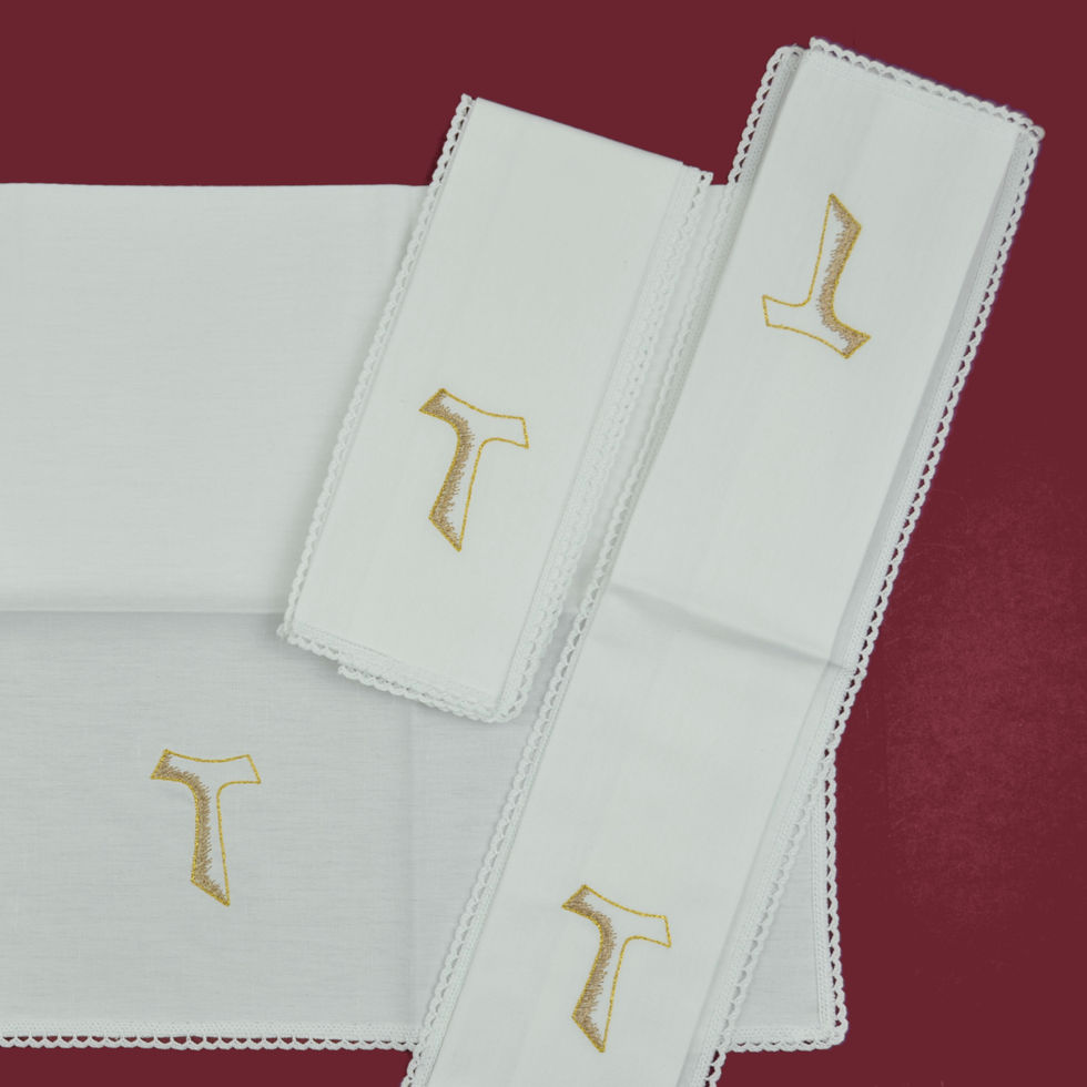 Raffinato Servizio S.Messa tessuto m/lino ricamo Tau con merletto bianco.