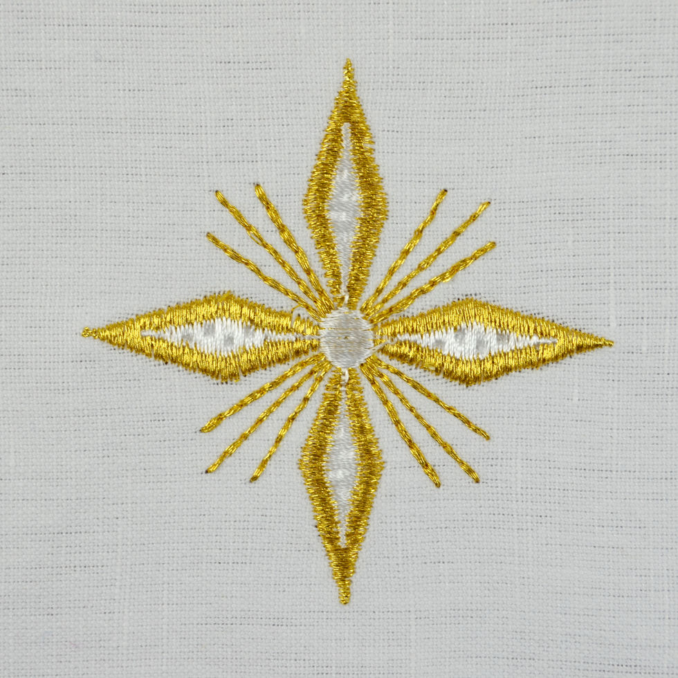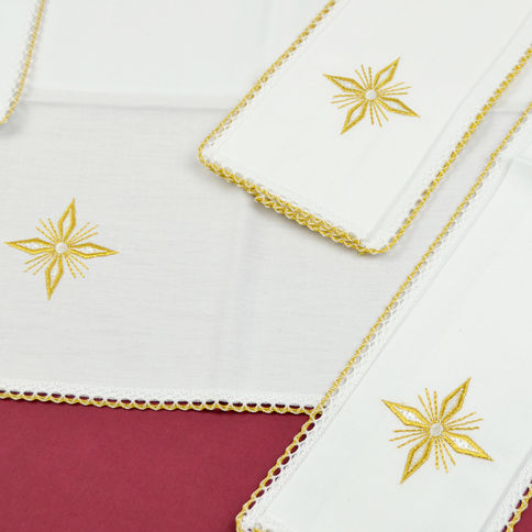 Raffinato Servizio S.Messa tessuto m/lino ricamo Croce oro con merletto bianco/oro.