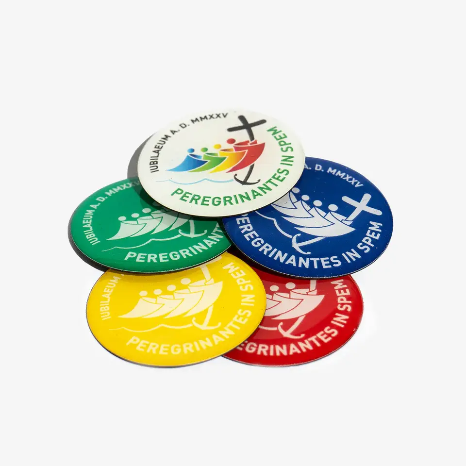 Kit magneti Giubileo 2025 realizzato in alluminio diametro cm.4, composto da n.5 magneti nei colori ufficiali del logo Giubileo 2025.